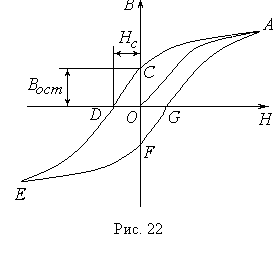 При помещении в соленоид ферромагнитного сердечника поле в нем усиливается во много раз (m >> 1); так как магнитная проницаемость ферромагнетика существенно зависит от напряженности поля, соотношение В = m×m 0× Н становится нелинейным. Кроме того, величина магнитной индукции В зависит от предыстории материала (от значения напряженности в предыдущие моменты времени); вследствие этого изменение величины В отстает от изменения Н. Это явление получило название гистерезиса (запаздывания). Типичная зависимость В (Н) для ферромагнетика – петля гистерезиса – изображена на рисунке. Пусть перед началом опыта стержень размагничен (В = 0) и ток в цепи отсутствует (Н = 0). Начальный участок петли ОА, соответствующий увеличению напряженности Н от нуля до максимального значения, называется основной кривой намагничения. При уменьшении напряженности до нуля (участок АС петли) поле в ферро-магнетике не исчезает; остаточное намагничение характеризуется значением магнитной индукции Вост. Для снятия намагничения необходимо приложить внешнее магнитное поле противоположного направления (участок CD). Соответствующее значение напряженности Нс называется коэрцитивной силой. Дальнейшее увеличение напряженности до максимального значения (DE), уменьшение до нуля (EF) и, после изменения направления внешнего поля на первоначальное, увеличение до максимума (FA) замыкают петлю.