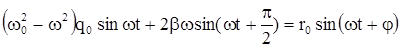 Рис.31.Графическое решение дифференциального уравнения. | Обращаясь к векторному представлению колебаний, нетрудно заметить, что вектор r0, стоящий в правой части уравнения является суммой двух других векто-ров, представляющих колебания в левой части. Из рис.31 по теореме Пифагора откуда (Р) |