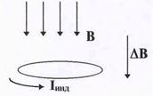 Рис.34. Направление индукционного тока. | кону Фарадея в витке возникает ЭДС индукции. Направление индукционного тока таково, что он своим действием препятст-вует изменению магнитного поля. Если внешнее магнитное поле возрастает, его изменение DВ направлено по полю (см. рис.34), и напрвление индукционного тока должно быть таким, чтобы маг-нитный момент витка Iинд S был нап равлен против поля В. Как уже указывалось (§6-4) величина ЭДС индукции определяется выражением |
