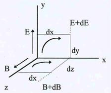 векторов Е и В по периметру прямоугольников. Для вычисления используем тот же прием, с помощью которого была определена величина вектора магнитной индукции на оси длин-ного соленоида. Направление обхода контуров выберем по часовой стрелке, и учтем, что величины Е и В могут зависеть от х. На расстоянии dx от начала координат они принимают значения Е + dЕ и В + dВ соответственно. При этих условиях