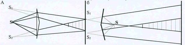 Рис.42. Интерференционные схемы: а)бипризма Френеля, б)билинза Френеля.