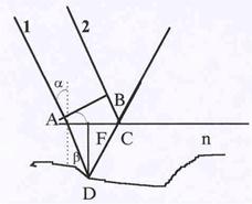 1 и 2 D = 2n(AD) – BC +l/2. Величина l/2 добавляется потому, что происходит изменение фазы волны на 180 0, что эквивалентно увеличению пути на l/2.Из рис можно увидить, что AD = DF/cosb;AF = DFtgb;AC = 2AF= =2DFtgb;BC =ACsina = 2DFtgb sina. Согласно закону преломления света sina = nsinb. C учетом этого D= 2nDF/cosb - 2DFsinatgb + +l/2 = 2nDF(1- -sin2b)/cosb +l/2 = 2DFcosb +l/2.