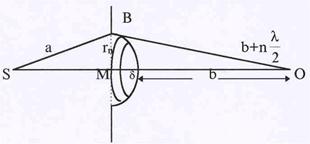 дошедший до экрана, имеет радиус SB = а (см. рис.47). Расстояние от точки наблюдения О до плоскости экрана равно МО = b+d. Мысленно разобьем волновой фронт на концентри-ческие зоны (на рис.47 показана одна зона) так, что расстояние от n – зоны до точки наблю-дения О равно b + nl/2. Из треугольника SBM по теореме Пифагора получим: