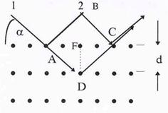 Рис.52. Дифракция рентгенов- ских лучей. | поэтому наблюдать дифракцию этих лучей в стандар-тных схемах не удается. Препятствиями, размеры кото-рых сравнимы с длиной волны рентгеновских лучей, могут служить лишь межатомные расстояния в твер-дых телах. Схема дифракции показана на рис.52. Ато-мы кристалла расположены в правильном порядке, об-разуя плоскости, отражающие лучи. Коэффициент пре-ломления лучей близок к единице, и лучи отражаются от различных плоскостей без заметного преломления (nр » 1). Обозначая угол скольжения лучей через a, а расстояние между отдельными слоями через d, можно |