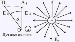 только с одним направлением плоскости колебаний электрического вектора Е, так что на выходе поляризатора свет становится плоско (линейно) поляризованным. Человеческий глаз не в состоянии обнаружить, поляризован свет или неполяризован. Для того, чтобы обнаружить это, необходимо использовать второе такое же приспособление, которое на-зывают анализатором. Если направление пропускания анализатора и поляризатора совпа-дают, луч света на выходе из анализатора имеет максимальную интенсивность. При про-извольном угле a между направлениями анализатора и поляризатора (см.рис.53) амплитуда световых колебаний, выходящих из анализатора ЕА = ЕП cosa, где ЕП – амплитуда колеба-ний на выходе из поляризатора. В электромагнитной волне плотность энергии (интенсив-ность) пропорциональна квадрату амплитуды колебаний Е, т.е. I П ~ Е