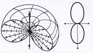 Рис.55. Индикатрисса излучения диполя. | играет внешний электрон, а вся остальная часть атома рассматривается как положи-тельный заряд (ион). Т.к. масса положитель-ного иона во много раз (более 2000) больше, чем масса электрона, можно рассматривать лишь колебания электрона. Строгая теория электромагнетиза показывает, что колеблю-щийся диполь становится излучателем элек-тромагнитных волн, причем интенсивность излучения различна в разных направлениях. Для иллюстрации анизотропности излуча- |