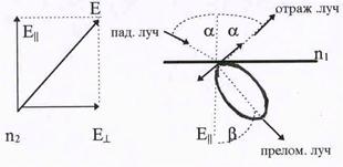 Положения рассмотренной модели применим для объяснения закона Брюстера. В па-дающем на границу раздела двух сред естественном свете вектор Е принимает всевозмож-ные направления (см.рис.53), но без ограничения общности можно рассматривать лишь два: