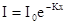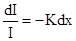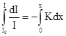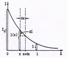 Рис.57. Изменение интенсивнос- ти света при его поглощении. | интенсивности, т.е.отношение изменения интенсив-ности dIв этом слое к интенсивности падающего света I(х) (см.рис.57),пропорциональна толщине слоя: , где коэффициент К, зависящий от свойств вещества, называется коэффициентом поглощения.Знак минус отражает убывание интенсивности с ростом х. Измене-ние интенсивности света при прохождении слоя конеч-ной толщины х находится путем прямого интегри-рования вышеприведенной формулы: . |
