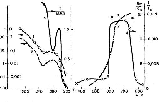 1—спектр действия инактивации и 2 — спектр поглощения трипсина (a—поперечное сечение инактивации, D — оптическая плотность). 3—спектр действия УФ-эритемы человека. 4 — спектр действия фотопериодической стимуляции полового созревания утят (S„/S„ — отношение размеров семенников конце и начале опыта), 5 — спектр пропускания (I/I0) тканей головы утят со стороны глазных орбиталей до гипоталамуса.