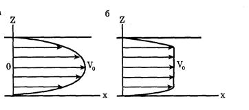 Рис. 1. Профиль осредненных скоростей при ламинарном (а) и