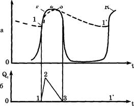 Рис. 9.8. Изменение гемодинамических показателей при сокращении сердца: а - давление крови в аорте (штриховая линия) и давление в левом желудочке сердца (сплошная); б - объемная скорость поступления крови в аорту во время систолы. Кривые F соответствуют первому сокращению, R - повторение процесса; точки 1 и Г соответствуют моментам открытия аортального клапана, точка 3 - | закрытию, точка 2 - момент времени, когда Q^ достигает максимального значения