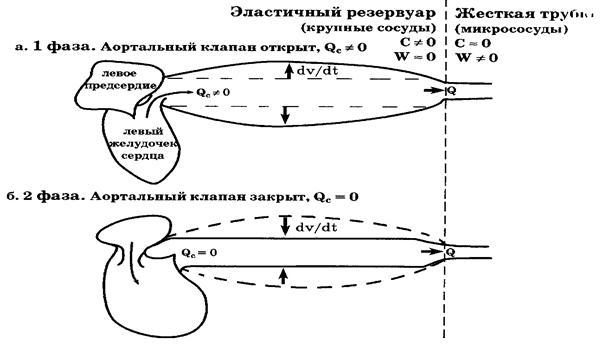 Для удобства рассмотрения выделим две фазы кровотока в системе "левый желудочек сердца - крупные сосуды - мелкие сосуды" (рис. 9.8, 9.9):