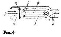Датчики сопротивления выполняются или в виде тонкой проволоки из специального сплава, или в виде столбика из вещества, сопротивление которого сильно изменяется при растяжении или сжатии, например из кремнийорганической резины (силикон), прессованной металлизированной смолы и т. п. Концы проволоки или столбика скрепляются с основой и подвижным элементом датчика. На рис. 4 показана схема резистивного датчика для измерения давления. Жидкость под давлением р, заполняющая камеру К, прогибает мембрану М, Мембрана в центре соединена с движком Д, растягивающим при этом петлю R из тонкой проволоки, концы которой закреплены в стойках С. При растяжении проволоки изменяется ее сопротивление. Концы проволоки с помощью проводов П подключаются к измерительному (или регистрирующему) прибору, в котором изменение сопротивления проволоки вызывает отклонение стрелки, соответствующее давлению на мембрану.