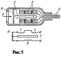 Индуктивный датчик состоит из электромагнита с незамкнутым сердечником и замыкающим его подвижным якорем. В зависимости от положения якоря изменяется индуктивное сопротивление катушки электромагнита, которая подключается к измерительному или регистрирующему устройству. К индуктивным датчикам относится трансформаторный датчик. Например, датчик давления (рис. 5), состоящий из двух катушек К (I и II), связанных общим сердечником С, соединенным с мембраной М. На первичную катушку подается переменное напряжение (4—5 кГц). Измеряется напряжение, индуктируемое во вторичной катушке, величина которого зависит от положения сердечника (П — провод).