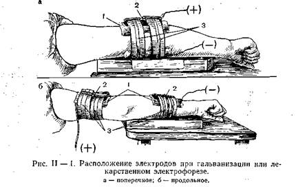 Два электрода с прокладками накладывают на поверхность тела так, чтобы подлежащая воздействию тока область находилась между ними. Применяется как поперечное, так и продольное расположение электродов. Последние укрепляются эластичными бинтами. На рис. II—I