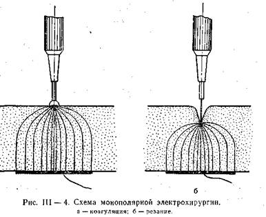Имеется два основных вида злектрохирургии: сваривание ткани — электрокоагуляция и рассечение ткани — электротомия.