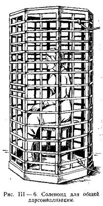 На рис. Ill—6 показана вертикально расположенная катушка —со- леноид, применявшаяся в искровых аппаратах для общей дарсонвализации. Ток, протекающий по виткам катушки, образует внутри нее высокочастотное магнитное поле с максимальной индукцией 1—2 мТ.