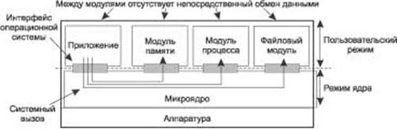 - Вторая часть операционной системы содержит небольшое микроядро (microkernel), содержащее исключительно код, который выполняется в режиме ядра. На практике микроядро должно содержать только код для установки регистров устройств, переключения процессора с процесса на процесс, работы с блоком управления памятью и перехвата аппаратных прерываний. Кроме того, в нем обычно содержится код, преобразующий вызовы соответствующих модулей пользовательского уровня операционной системы в системные вызовы и возвращающий результаты.