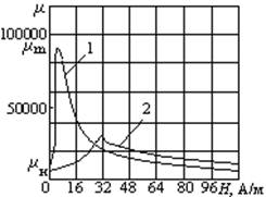 Магнитная проницаемость зависит от напряженности магнитного поля (рисунок 9.1-б). Кривая 1 на этом рисунке относится к пермаллою, а кривая 2 – для чистого железа. Различают начальную магнитную проницаемость μн и максимальную μm. Начальную магнитную проницаемость измеряют при нап-ряженности магнитного поля, близкой к нулю. Большие значения μн и μm показывают, что данный магнитный материал легко намагничивается в сла- бых и сильных магнитных полях.