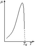 Типичная зависимость магнитной проницаемости от температуры пока- зана на рисунке 9.2. Температура, при которой магнитная проницаемость рез- ко снижается почти до нуля, называется точкой Кюри (ТК). При температурах выше процесс намагничивания ферромагнетика расстраивается из-за интен-сивного теплового движения атомов и молекул материала, в результате чего он перестает быть ферромагнитным материалом. Так, ТК для чистого железа 768°С, для никеля 358°С, для кобальта 1131°С.