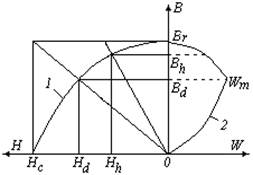 Кривые 1 размагничивания и 2 удельной магнитной энергии разом-кнутого магнита изображены на рисунке 9.2-б. Кривая 1 показывает, что при некотором значении индукции Вd и соответствующей напряженности магнитного поля Нd удельная объемная энергия постоянного магнита достигает максимального значения WМ . Это наибольшая энергия, создаваем-ая постоянным магнитом в воздушном зазоре между его полюсами, отнесен-ная к единице объема магнита. Чем больше значение WМ , тем лучше магни-то-твердый материал и, следовательно, лучше изготовленный из него магнит.