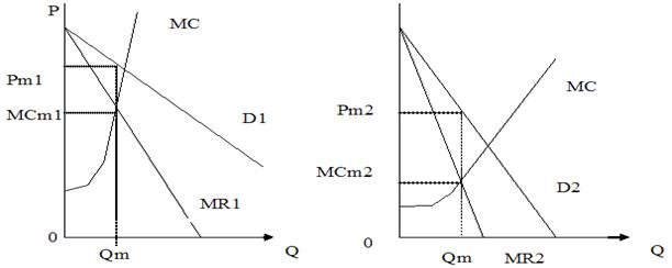 Индекс Лернера показывает, что монополист имеет лишь ограниченный контроль над ценой. Если ценовая эластичность спроса велика (значительно превышает единицу по абсолютной величине), то цена, максимизирующая прибыль монополиста, будет лишь немного превышать предельные издержки MCm1. Менее эластичная кривая рыночного спроса D2 обеспечивает большую монопольную надбавку к конкурентной среде (рисунок 1.3).