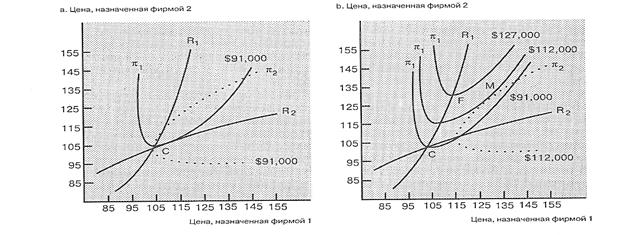 Двигаясь из точки С по диагонали на северо-восток (т.е. повышая цены обоих продавцов), можно увеличить прибыль каждого из них. Такие увеличения возможны до момента, когда кривая изоприбыли фирмы 1 является касательной к подобной кривой фирмы 2 (в точке Мна рис. 5.2 (b)). В этой точке каждая фирма назначает цену — 128 долл. за единицу продукции и получает прибыль — 112 тыс. долл.