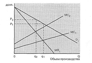 Предположим, однако, что фирма 2 имеет более высокую функцию предельных издержек МС2, выведенную из ТС2 = 20 000 + 40q2 + (- 0,02q22). Это может произойти потому, что фирма 2 обладает природными ресурсами невысокого качества, или потому, что она решила построить предприятие с низкими первоначальными постоянными издержками, но с высокими и растущими предельными издержками. Фирма 2 с высокими издержками сочтет цену в 147 долл. за единицу при выпуске 1333 единиц оптимальной, в то время как фирма 1 с низкими издержками (функция предельных издержек MC1) по-прежнему предпочитает цену 128 долл. за единицу. Возникает конфликт между ценовыми и производственными предпочтениями разных компаний.