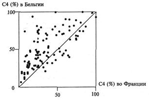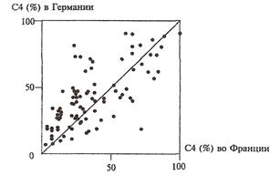 Теперь перейдем к практике. На рис. 15 приводятся данные о концентрации рынка в ряде отраслей Франции и Германии. Другими словами, в каждой отрасли любой точке на графике по горизонтальной оси соответствует значение СR4 во Франции, а любой точке по вертикальной оси соответствует значение СR4 в Германии. Например, если в определенной отрасли четыре крупнейшие французские фирмы владеют 40%-ной долей рынка, а на четыре крупнейшие немецкие фирмы приходится 60 % доли рынка, то на диаграмме образуется точка с координатами (0,4; 0,6). На рис. 16 представлена аналогичная диаграмма, но на ней сопоставляются Франция и Бельгия.