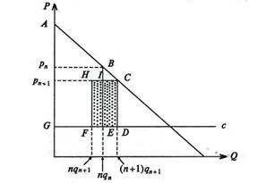 На рисунке видно, что сумма, на которую увеличивается валовой излишек (площадь ВCI плюс CDEI), меньше валовой прибыли, которую получает последняя вошедшая на рынок фирма (площадь CDFH). Это означает возможность серьезного расхождения частной и общественной мотивации входа на рынок n+1-й фирмы. Допустим, что издержки входа А: таковы, что BCI + CDEI< к < CDFH. В этом случае вход на рынок выгоден с частной точки зрения (положительная чистая прибыль), но не с общественной (увеличение валового излишка не возмещает издержек входа). При таких обстоятельствах свободный вход привел бы к избыточному входу.