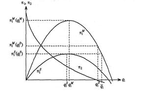 ), что намного ниже величины монопольной прибыли. Допустим, что Фирма 1 выводит свой объем производства на уровень, превышающий монопольный. А именно, допустим, что