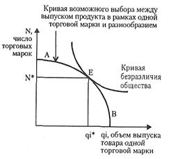 Оптимальной для общества служит комбинация q* - выпуска товара одной торговой марки и N* - числа торговых марок на рынке, когда для общества предельная норма замещения количества разнообразием равна предельной норме трансформации разнообразия в количество. Комбинация В характеризовала бы оптимальный выбор общества при нулевом разнообразии (отсутствии дифференциации продукта) и минимальном значении средних издержек в долгосрочном равновесии только в случае, если разнообразие было бы нейтральным благом для общества, с нулевой предельной полезностью, что заведомо не так. Положительное значение показателя дифференциации продукта, характеризующее оптимальный выбор общества, в свою очередь, сопровождается «избыточной мощностью».