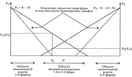Для каждого продавца чистая цена, которую он может получить за свой товар, зависит, с одной стороны, от максимальной готовности платить за товар, с другой стороны, от удаленности покупателя от продавца. Чем дальше покупатель расположен от продавца, тем ниже чистая цена, которую может получить продавец. Для первого продавца зависимость его чистой цены от местоположения покупателя описывается формулой P1 = Ө - tX, где X - расположение покупателя, принадлежит интервалу [0; 1], для второй фирмы Р2 = Ө - t(l - X) (рис. 7.3).