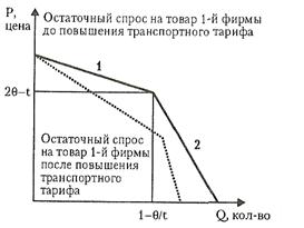 Второй участок линии остаточного спроса соответствует области ценовой конкуренции. На этом отрезке фирмы обладают возможностью борьбы за передел рынка: покупатель будет приобретать товар даже у более отдаленного от него продавца, если тот назначает более низкую цену с учетом транспортных расходов. На этом участке объем остаточного спроса на товар фирмы описывается формулой: