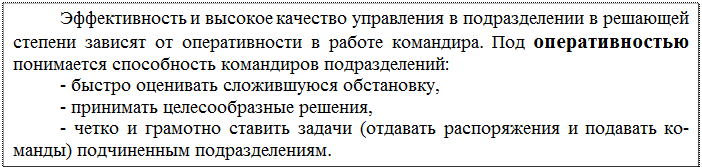 Особенно высокая оперативность необходима командиру взвода (отделения, танка) при выполнении задач в разведке и походном охранении; малейшее промедление командира в подаче команд при внезапной встрече с противником может привести к тяжелым последствиям.