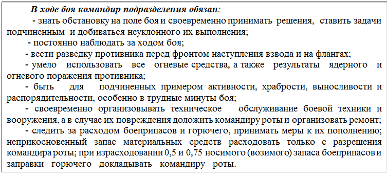 ПОРЯДОК И СОДЕРЖАНИЕ РАБОТЫ КОМАНДИРА ПО ОРГАНИЗАЦИИ РАЗЛИЧНЫХ ВИДОВ БОЯ И ДЕЙСТВИЙ ПОДРАЗДЕЛЕНИЯ.