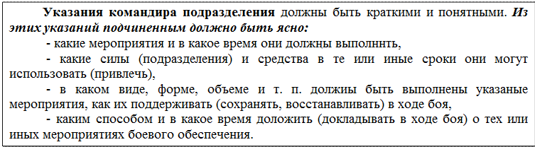 При этом командир подразделения определяет какими способами можно добиться, чтобы мероприятия по боевому обеспечению были выполнены в срок, точно, скрытно, наиболее аффективно.
