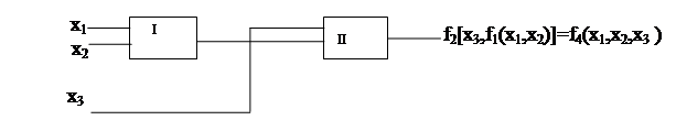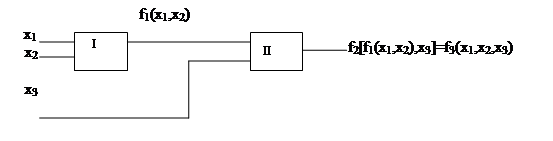 Последовательное соединение двух логических элементов позволяет получить функцию f3 трех аргументов. Подстановка в функцию вместо ее аргументов других функций называется суперпозицией.