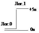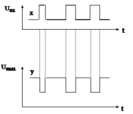 На вход инвертора подается цифровой сигнал, величина напряжения которого соответствует значению аргумента ПФ. Например, если x=1, то это напряжение составляет +5 В, а если х=0, то 0 В (рис.2.2). На выходе инвертора получается сигнал, представляющий значение функции отрицания НЕ, т.е. значение, обратное входному (рис.2.3): y=1 (на выходе +5 В, если на входе 0 В) или y=0 (на выходе 0 В, если на входе +5 В). Нужно сказать, что на временной диаграмме инвертора допущена некоторая условность: судя по диаграмме, переключение цифрового сигнала происходит мгновенно, в действительности же любой физический процесс в логических элементах протекает за определенное время.
