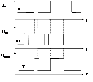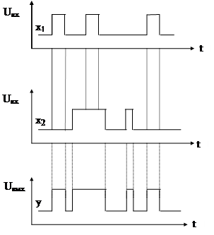Логический элемент И. Этот элемент реализует ПФ конъюнкции или логического произведения. Иногда логический элемент И называют конъюнктором, а также схемой совпадения, что отражает существо работы этого элемента: цифровой сигнал, соответствующий значению логической единицы, появляется на выходе схемы только тогда, когда совпадут по времени единичные значения цифровых сигналов на входе. На рис.2.4 представлено схематическое изображение элемента, а на рис.2.4 - его временная диаграмма.