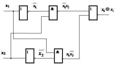 Рис. 2.12. Схема сумматора по модулю два на элементах И, ИЛИ, НЕ