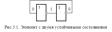 Основу триггера составляет кольцевая схема из двух инверторов (рис.3.10). Если левый инвертор на выходе имеет единичный сигнал, то он передается на вход правого инвертора. На выходе правого формируется нулевой сигнал, который передается (по цепи обратной связи) на вход левого инвертора. На выходе левого инвертора подтверждается единичный сигнал. Таким образом, это состояние является устойчивым состоянием, которое может сохраняться сколько угодно долго.