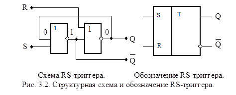 В таблице 3.1 представлены переходы RS-триггера, а на рис.3.2 – схема и обозначение RS-триггера на функциональных схемах.