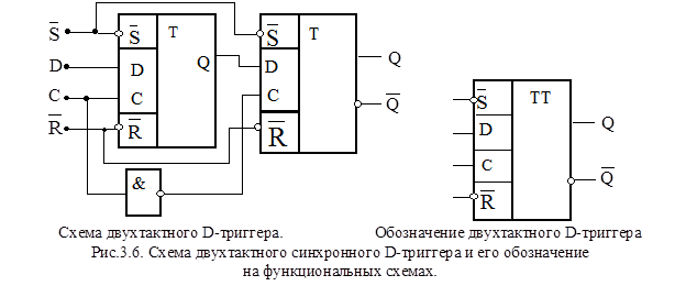 На рис.3.6. представлена схема и обозначение двухтактного D-триггера на функциональных схемах.