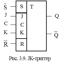 Обозначение JK-триггера с инверсным динамическим входом приведено на рис.3.9. Наклонная черта "смотрит слева - направо - сверху - вниз". JK-триггер функционирует аналогично RS-триггеру, но в отличие от последнего, не имеет запрещенных комбинаций сигналов на входах.