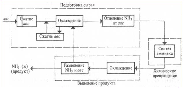 Из схемы видно, что производство аммиака включает следующие стадии: подговку сырья, заключающуюся в сжатии азотоводородной смеси, ее охлаждении и отделении от сконденсировавшегося аммиака, синтеза аммиака и выделения продукта путем охлаждения и отделения непревращенной азотоводородной смеси от целевого продукта. Схема предусматривает рецикл азотоводородной смеси.