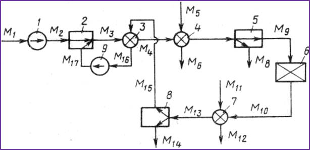 1 – компрессор; 2- инжектор: 3 — теплообменник: 4 — аммиачный холодильник (испаритель жидкого аммиака): 5, 8 — сепараторы; 6 — колонна синтеза аммиака (реактор); 7 — водяной холодильник; 9 — циркуляционный компрессор; М1 — М17 — физические потоки
