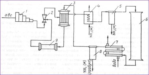 1—компрессор; 2 — инжектор; 3 — теплообменник; 4 — испаритель жидкого аммиака; 5, 6 - сепараторы; 6 — колонна синтеза; 7 — водяной холодильник; 9 — циркуляционный компрессор