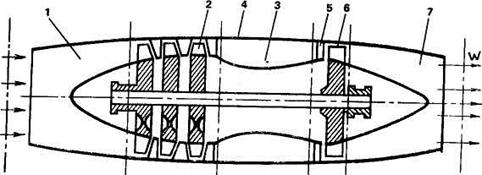 1 — входное устройство; 2— компрессор; 3 — камера сгорания; 4— корпус двигателя; 5— сопловой аппарат; 6— турбина; 7 — реактивное сопло