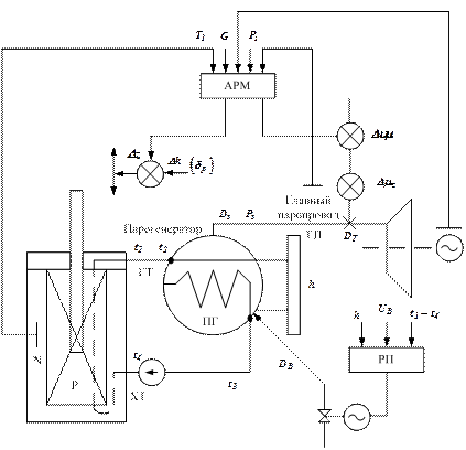 - изменение параметров перегревателя; необогреваемые участки первого контура – горячий (ГТ) и холодный (ХТ); необогреваемые участки второго контура – ГП и РП; АРМ – система автоматического регулирования мощности, осуществляющая перемещение управляющих (регулирующих) стержней, поддерживая на заданном уровне